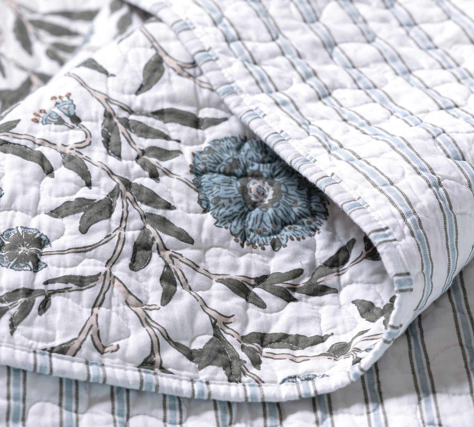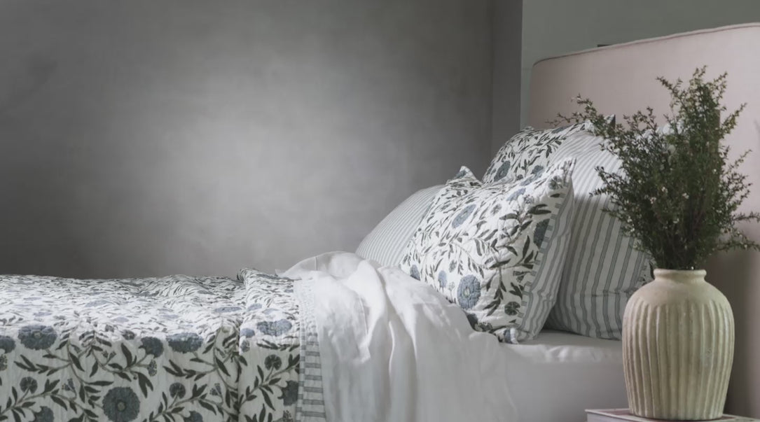 Collectible, colourful and charming, our Willa quilted bedding features a block-print inspired botanical design with a striped reverse.