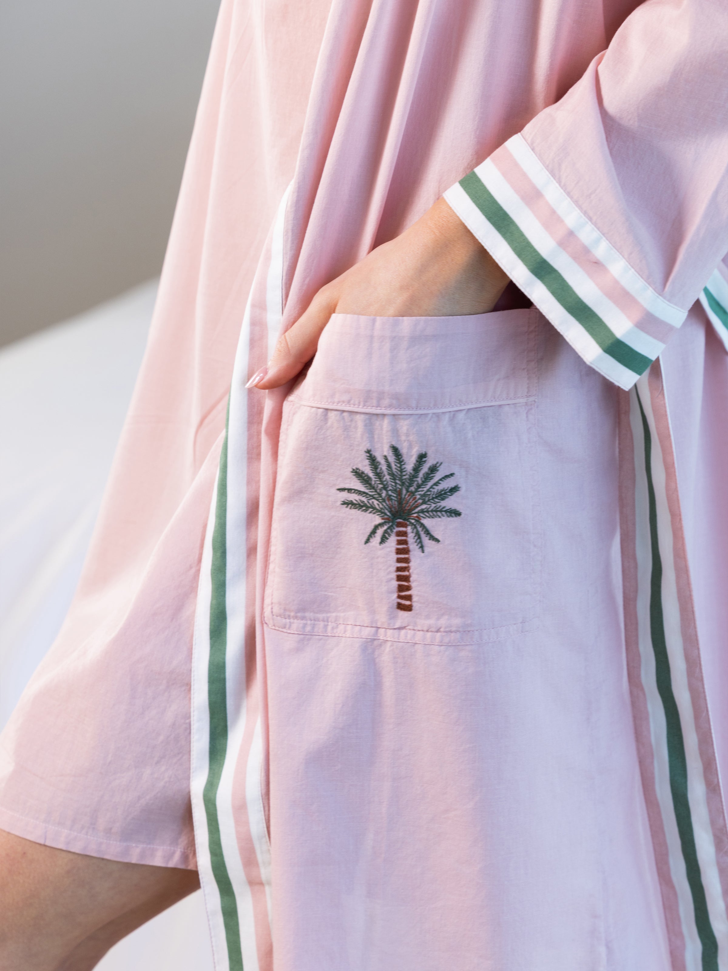Embracing a tropical, ‘palm springs’ feel, our Paradiso sleepwear range is pretty in pale pink. Cool, lightweight and perfectly beautiful for wafting around in all summer long. Designed in pale pink with embroidered palm tree motifs on the pockets. Our Paradiso Robe has green, white and pink striped cuffs and fabric belt. Made from soft and sustainable organic cotton.