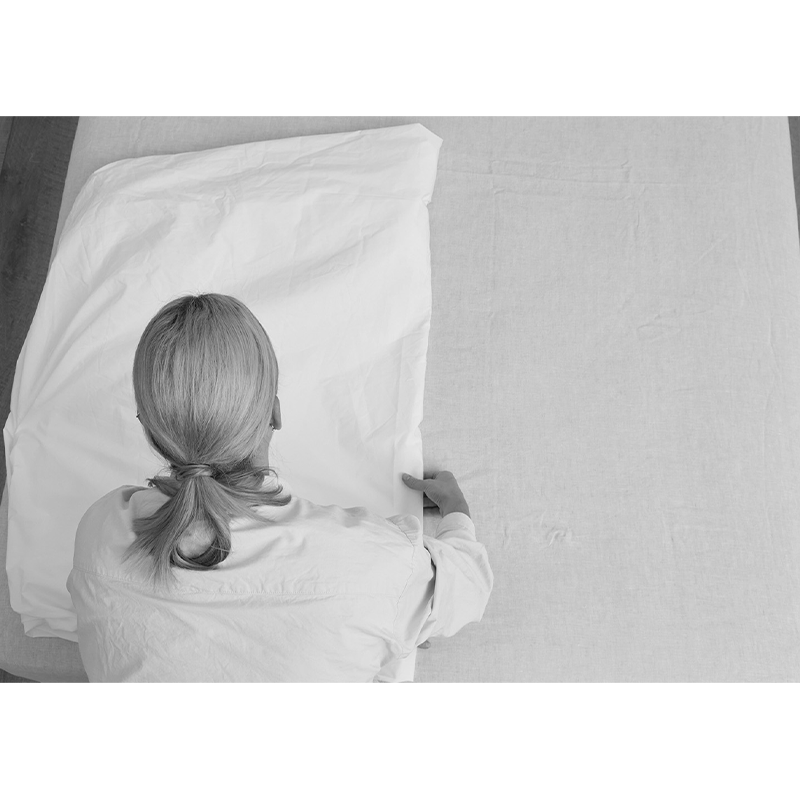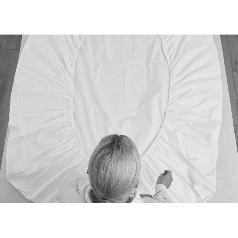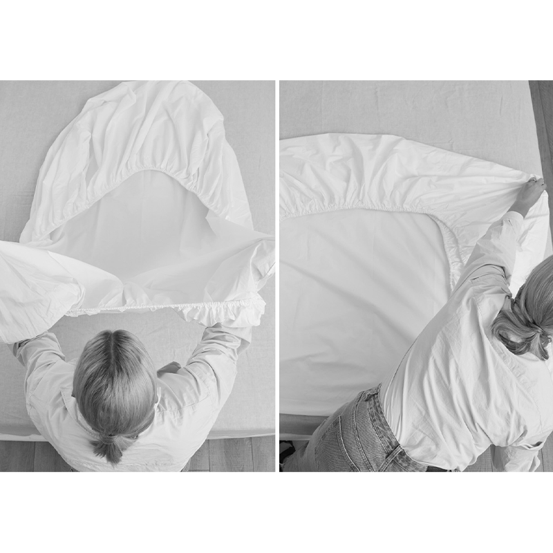 Fresh off the clothesline or warm out of the dryer, lay your fitted sheet out flat and neatly on your bed, with the elasticated side facing up.