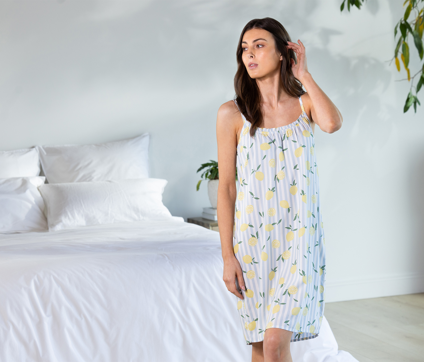 Our sleepwear pieces are made from beautiful natural fabrics which makes them easy to care for. We recommend a cold machine wash with mild soap, a line dry and warm iron for all our sleepwear collections. It is best to wash sleepwear separately from other items to avoid damage as they tend to be delicate. Do not bleach, soak, leave wet or tumble dry. Following our laundering instructions and caring carefully for your sleepwear items will keep them looking beautiful, to be worn for years to come. We also recommend having several sets of sleepwear so you can enjoy a fresh set every 4 to 5 days.