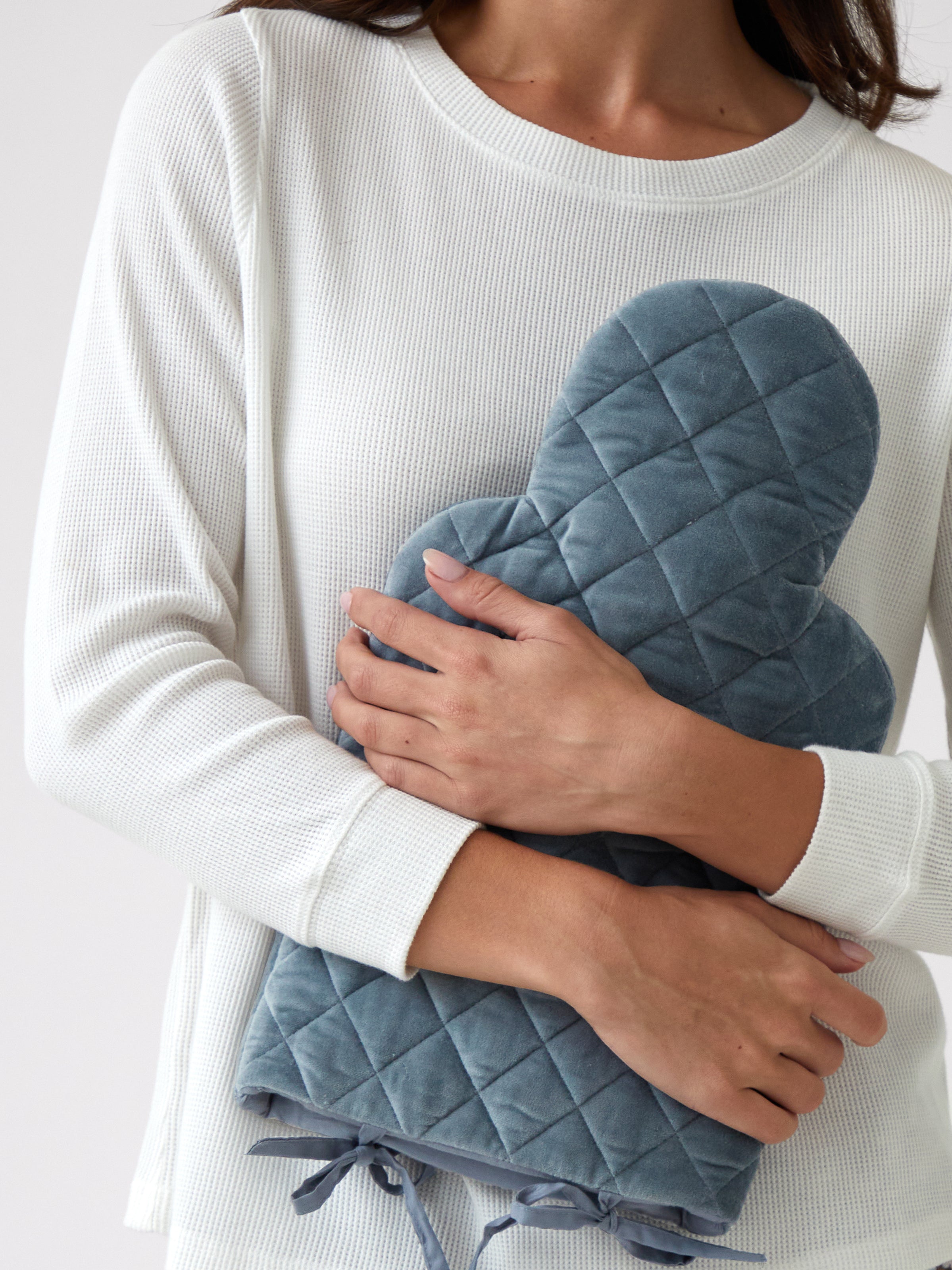 *Please note: hot water bottle is not included. Size: 23cm x 40cm. Made from velvet with cotton lining and cotton padding. Diamond quilting detail on both sides and fabric tie closures. Spot clean only. Designed with love in NZ and made exclusively for Wallace Cotton.