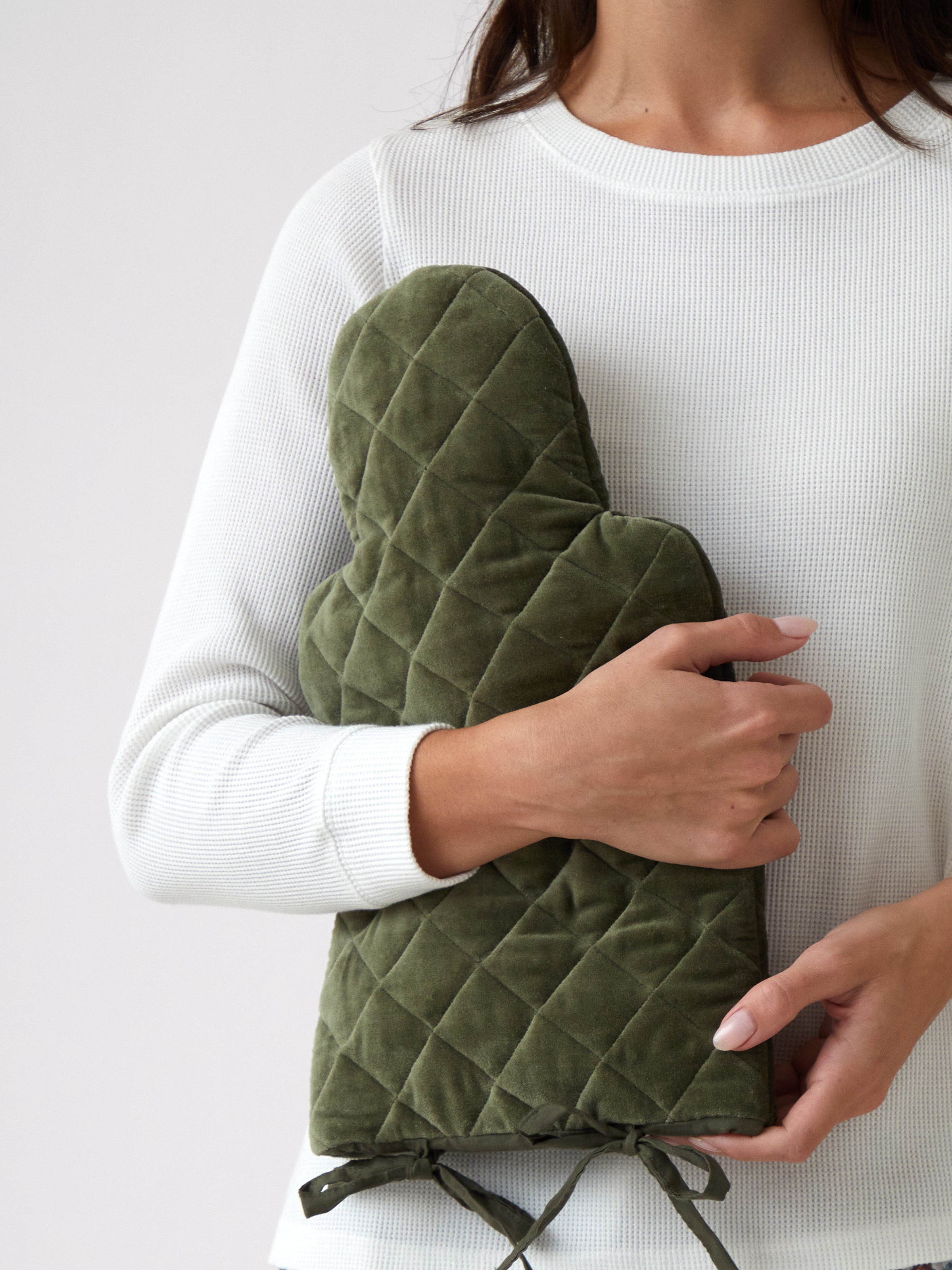 *Please note: hot water bottle is not included. Size: 23cm x 40cm. Made from velvet with cotton lining and cotton padding. Diamond quilting detail on both sides and fabric tie closures. Spot clean only. Designed with love in NZ and made exclusively for Wallace Cotton.