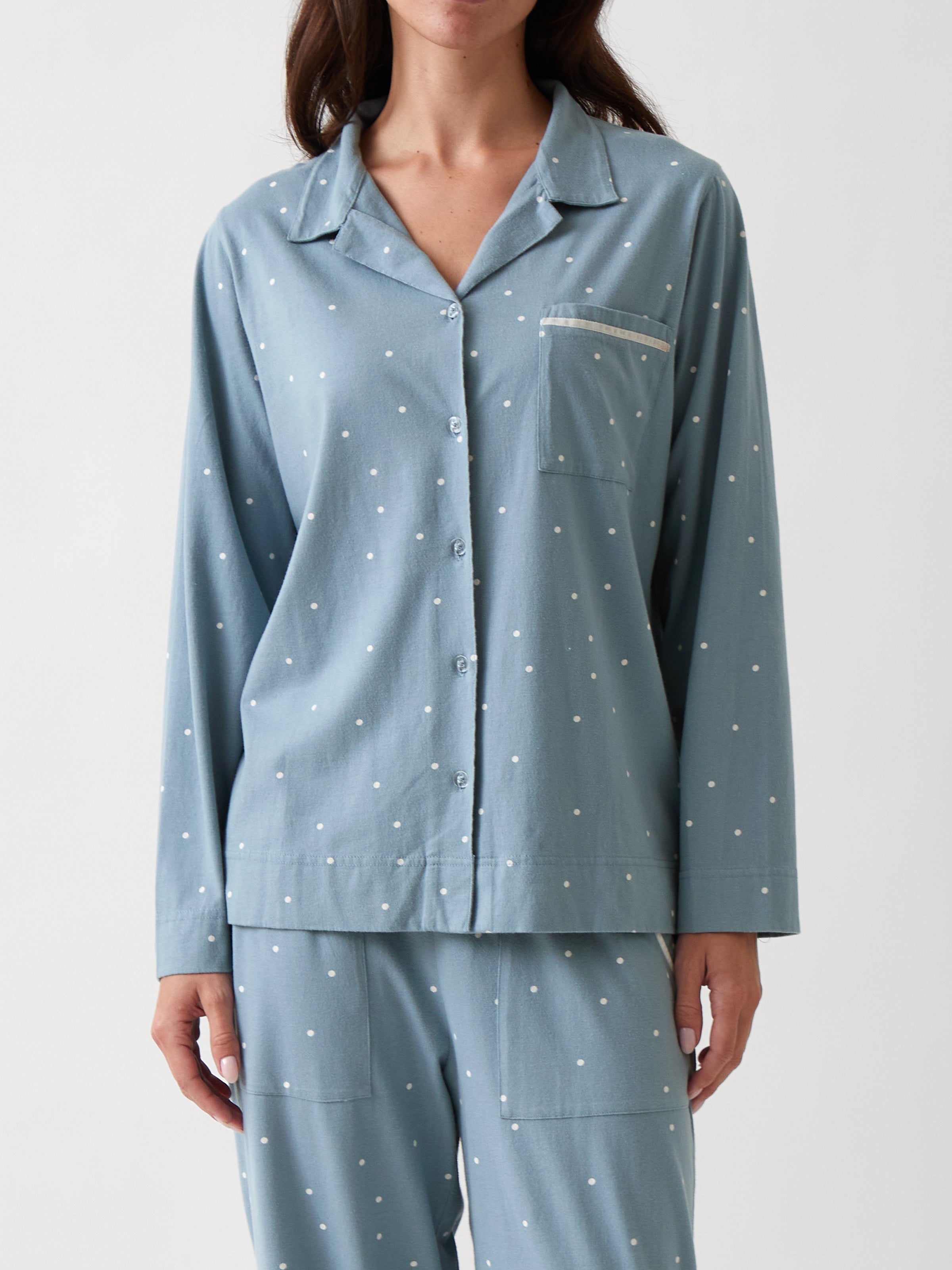 When the temperatures drop, turn to soft Organic Brushed Cotton Knit sleepwear to feel cosy and warm. Designed in comfy, classic styles perfect for cosy bedtimes, sofa snoozing and weekend lounging. Designed in mid-blue with white polka dots, our Georgie Organic Brushed Cotton Knit PJ Shirt is a relaxed fit with long sleeves, a button down front and a chest patch pocket with white velvet trim detail.