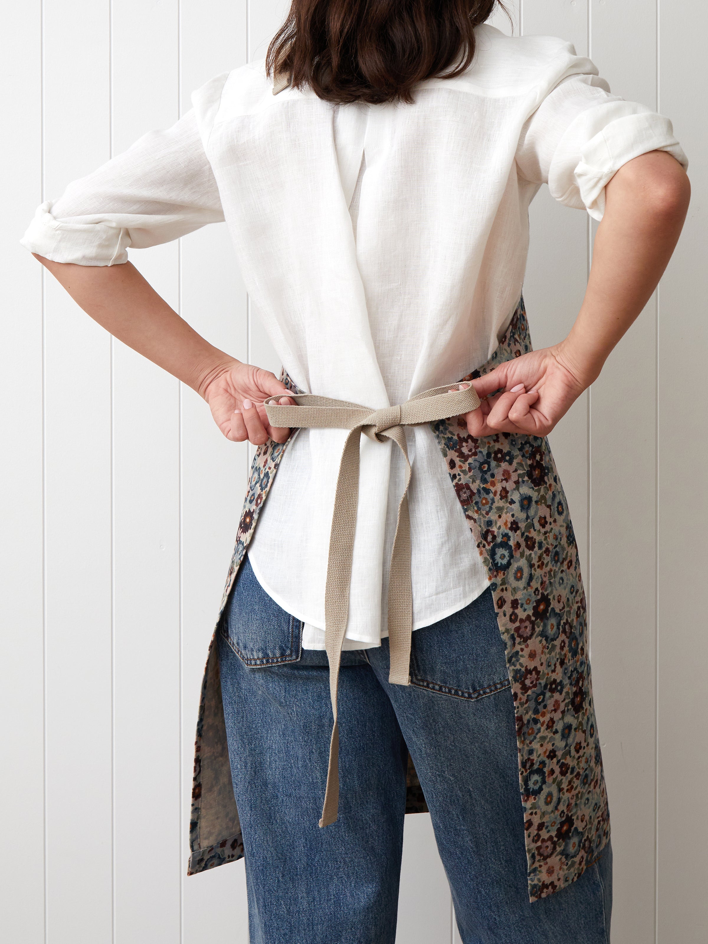 Make everyday more beautiful with pretty kitchen linens. Our Zinnia Everyday Apron is made from a durable European linen/cotton blend and features a wild flower ditsy floral design on natural linen. Our Zinnia Everyday Apron has a handy front pocket and natural cotton webbing straps. Beautiful, practical and giftable.